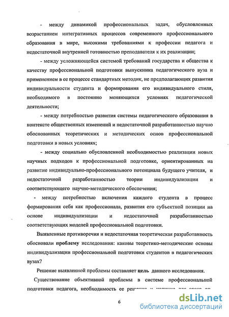 между социально обусловленной необходимостью реализации новых научных подходов к профессиональной подготовке, ориентированных на развитие индивидуально-профессионального потенциала будущего учителя, и недостаточной разработанностью теории индивидуализации и соответствующего научно-методического обеспечения;
