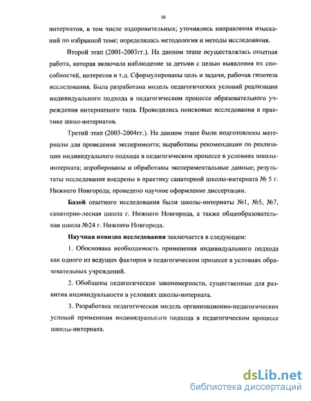 Третий этап (2003-2004гг.). На данном этапе были подготовлены материалы для проведения эксперимента; выработаны рекомендации по реализации индивидуального подхода в педагогическом процессе в условиях школы-интерната; апробированы и обработаны экспериментальные данные; результаты исследования внедрены в практику санаторной школы-интерната № 5 г. Нижнего Новгорода; проведено научное оформление диссертации.