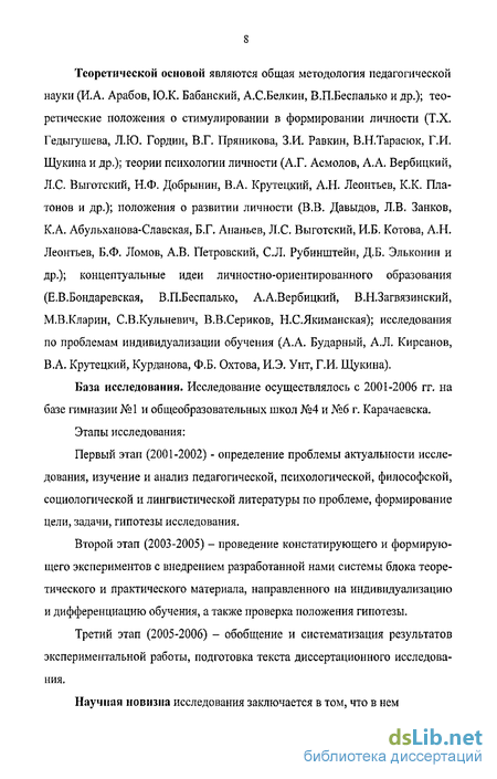 Теоретической основой являются общая методология педагогической науки (И.А. Арабов, Ю.К. Бабанский, А.С.Белкин, В.П.Беспалько и др.); теоретические положения о стимулировании в формировании личности (Т.Х. Гедыгушева, Л.Ю. Гордин, В.Г. Пряникова, З.И. Равкин, В.Н.Тарасюк, Г.И. Щукина и др.); теории психологии личности (А.Г. Асмолов, А.А. Вербицкий, Л.С. Выготский, Н.Ф. Добрынин, В.А. Крутецкий, А.Н. Леонтьев, К.К. Платонов и др.); положения о развитии личности (В.В. Давыдов, Л.В. Занков, К.А. Абульханова-Славская, Б.Г. Ананьев, Л.С. Выготский, И.Б, Котова, А.Н. Леонтьев, Б.Ф. Ломов, А.В, Петровский, С.Л. Рубинштейн, Д.Б. Эльконин и др.); концептуальные идеи личностно-ориентированного образования (Е.В.Бондаревская, В.П.Беспалько, А.А.Вербицкий, В.Н.Загвязинский, М.В.Кларин, С.В.Кульневич, В.В.Сериков, Н.С.Якиманская); исследования по проблемам индивидуализации обучения (А.А. Бударный, А.Л. Кирсанов, В.А. Крутецкий, Курданова, Ф.Б. Охтова, Н.Э. Унт, Г.И. Щукина).
