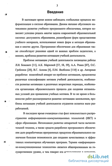 Панюкова СВ. [77], Фаустова Э.М. [99. С. 87-90], Вакулюк В. [14. С. 101-105], Ширшов Е.В. [106. С. 89-93], которые исследовали интенсивность использования средств ИКТ в учебной деятельности студента, принципы создания образовательных программных средств ИКТ, роль информационно-коммуникационных технологий в развитии системы образования, педагогические возможности отдельных программных продуктов, особенности использования ИКТ для организации различных видов занятий, но проблема развития мотивации учебной деятельности в вышеперечисленных работах также рассматривается лишь косвенно и не выделяется в самостоятельную.