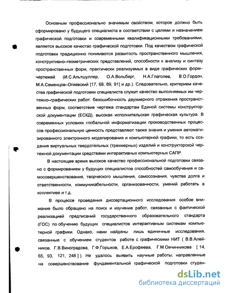В системе фундаментальной инженерной подготовки существенная роль принадлежит графическим дисциплинам. Исследованию проблем графического образования посвятили свои работы педагоги: И.Н.Акимова, Л.В.Андреева, О.В.Анякина, А.Я.Блаус, Г.Ф.Горшков, ЖЖЕсмуханова, Н.Н.Киселева, И.Б.Кордонская, В.И.Нилова, Н.Г.Плющ, Г.А.Хомиченко, Н.Ф.Четверухин, В.И.Якунин [11, 22, 26, 49, 93, 123, 160, 180, 242, 262, 352, 393, 410] и др.