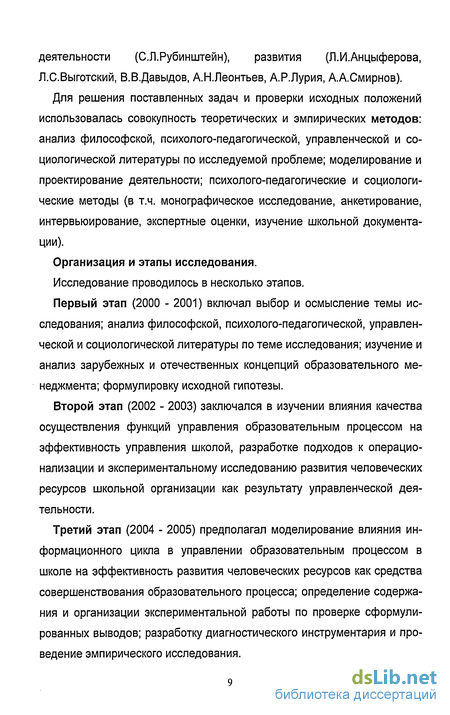 Второй этап (2002 - 2003) заключался в изучении влияния качества осуществления функций управления образовательным процессом на эффективность управления школой, разработке подходов к операцио-нализации и экспериментальному исследованию развития человеческих ресурсов школьной организации как результату управленческой деятельности.