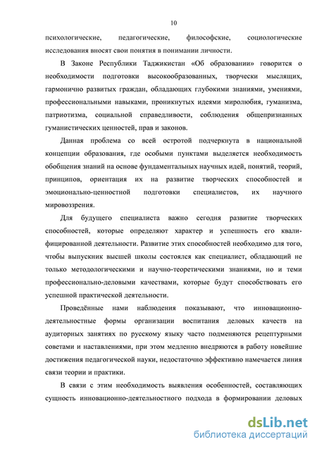 Исследование целостных качеств личности, из числа которых довольно значимой представляется готовность к деловому поведению, обусловлено природой рыночной экономики. В этой связи В.П. Беспалько [33], О.С. Гребенюк [86;87;89], Ф.К.Савина [280], Ю.М. Орлова [234] акцентируют проблему развития у студентов мотивационной готовности к труду равно как интегративного качества личности, содержащего его чувствительный, мотивационный и умственный составляющие, которые содействуют образованию организации социально-значимых мотивов труда, профессиональной личностной позиции, оценки и самооценки [280;339]. В настоящее время в Таджикистане усиленно осуществляются экономические реформы, итогом которых представляется образование и формирование новых финансовых, экономических, общественных и иных взаимоотношений, в которой основным типом хозяйствования представляется профессионал, владеющий деловыми свойствами и умениями.
