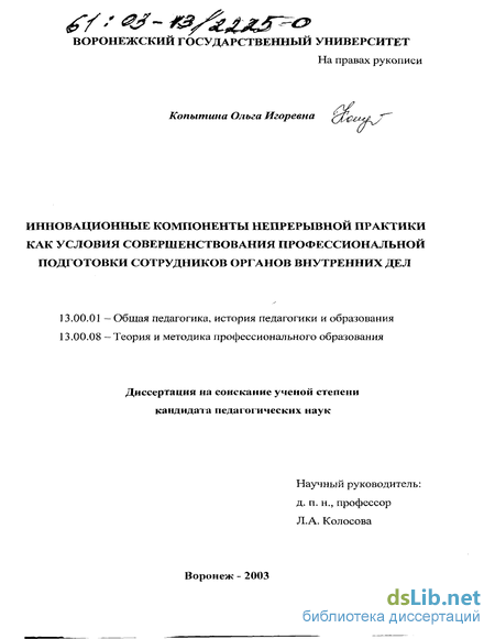 С учетом актуальности обозначенной проблемы, её практической значимости, перспективных тенденций развития науки определена тема исследования: «Инновационные компоненты непрерывной практики как условия совершенствования профессиональной подготовки сотрудников органов внутренних дел».