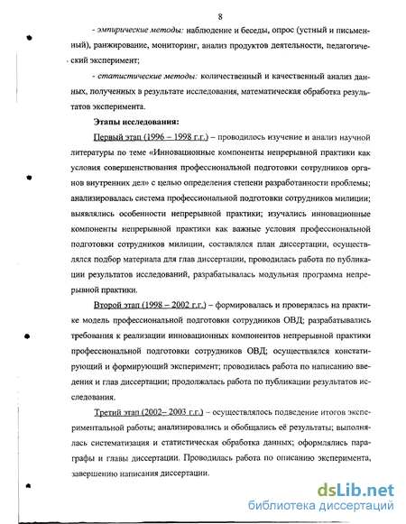 Первый этап (1996 - 1998 г.гЛ - проводилось изучение и анализ научной литературы по теме «Инновационные компоненты непрерывной практики как условия совершенствования профессиональной подготовки сотрудников органов внутренних дел» с целью определения степени разработанности проблемы; анализировалась система профессиональной подготовки сотрудников милиции; выявлялись особенности непрерывной практики; изучались инновационные компоненты непрерывной практики как важные условия профессиональной подготовки сотрудников милиции, составлялся план диссертации, осуществлялся подбор материала для глав диссертации, проводилась работа по публикации результатов исследований, разрабатывалась модульная программа непрерывной практики.