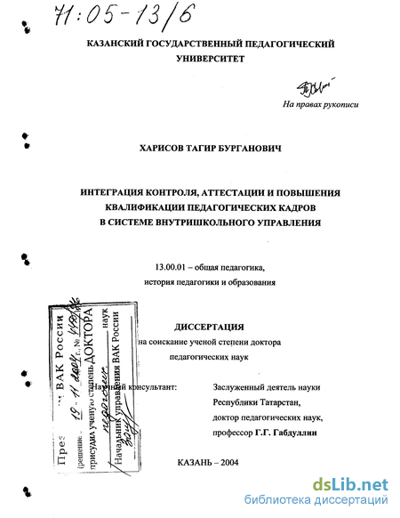Большое значение для соискателя имел многолетний опыт работы учителем, руководителем школы и районного отдела образования, начальником отдела министерства образования Республики Татарстан, заведующим кафедрой Института повышения квалификации работников образования. В процессе этой работы соискатель имел возможность изучить состояние практики организации контроля, аттестации и дополнительного профессионального образования педагогических кадров, наблюдать за данными явлениями в школе и "изнутри" (будучи их непосредственным участником и организатором), и "со стороны" (оказывая помощь и осуществляя руководство организацией данных направлений управленческой деятельности в качестве представителя вышестоящего органа управления).