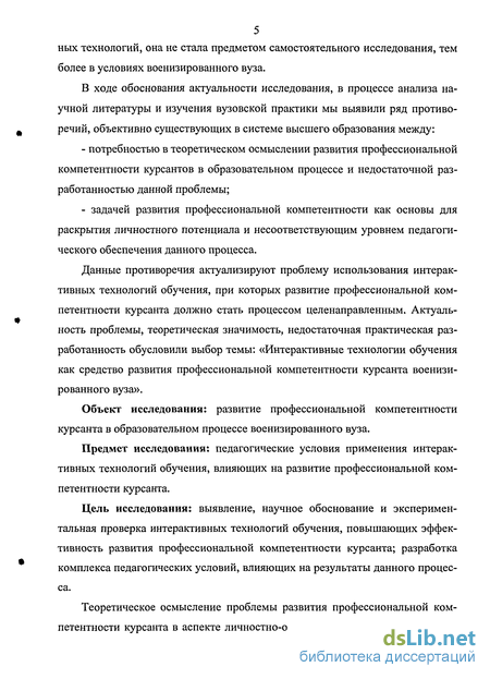 Данные противоречия актуализируют проблему использования интерактивных технологий обучения, при которых развитие профессиональной компетентности курсанта должно стать процессом целенаправленным. Актуальность проблемы, теоретическая значимость, недостаточная практическая разработанность обусловили выбор темы: «Интерактивные технологии обучения как средство развития профессиональной компетентности курсанта военизированного вуза».