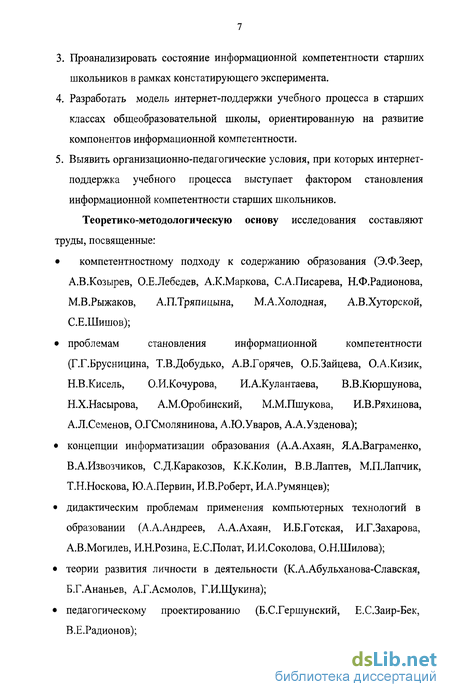 Цель исследования состоит в выявлении организационно-педагогических условий, при которых интернет-поддержка учебного процесса выступает фактором становления информационной компетентности старших школьников.