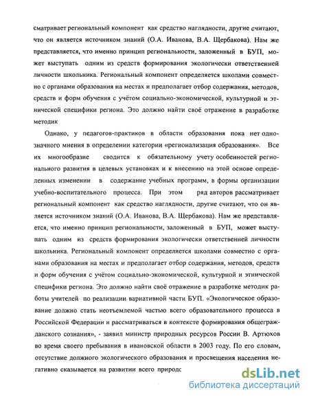 Однако, у педагогов-практиков в области образования пока нет однозначного мнения в определении категории «регионализация образования». Все их многообразие сводится к обязательному учету особенностей регионального развития в целевых установках и к внесению на этой основе определенных изменении в содержание учебных программ, в формы организации учебно-воспитательного процесса. При этом ряд авторов рассматривает региональный компонент как средство наглядности, другие считают, что он является источником знаний (О.А. Иванова, В.А. Щербакова). Нам же представляется, что именно принцип региональности, заложенный в БУП, может выступать одним из средств формирования экологически ответственней личности школьника. Региональный компонент определяется школами совместно с органами образования на местах и предполагает отбор содержания, методов, средств и форм обучения с учётом социально-экономической, культурной и этнической специфики региона. Это должно найти своё отражение в разработке методик работы учителей по реализации вариативной части БУП. «Экологическое образование должно стать неотъемлемой частью всего образовательного процесса в Российской Федерации и рассматриваться в контексте формирования общегражданского сознания», - заявил министр природных ресурсов России В. Артюхов во время своего пребывания в ивановской области в 2003 году. По его словам, отсутствие должного экологического образования и просвещения населения негативно сказывается на развитии всего природоохранительного блока, снижает