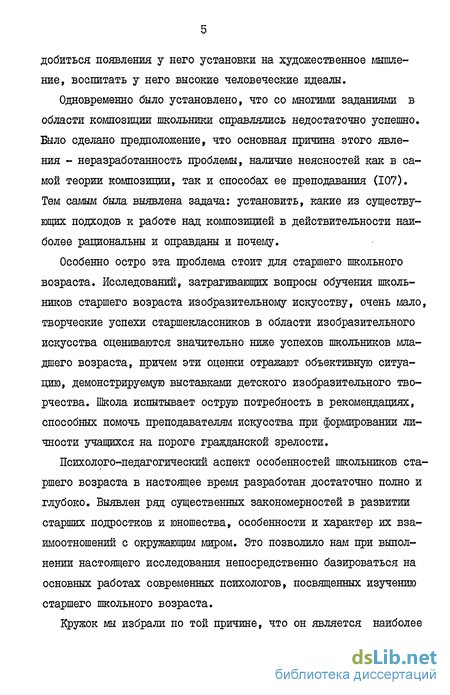 Особенно остро эта проблема стоит для старшего школьного возраста. Исследований, затрагивающих вопросы обучения школьников старшего возраста изобразительному искусству, очень мало, творческие успехи старшеклассников в области изобразительного искусства оцениваются значительно ниже успехов школьников младшего возраста, причем эти оценки отражают объективную ситуацию, демонстрируемую выставками детского изобразительного творчества. Школа испытывает острую потребность в рекомендациях, способных помочь преподавателям искусства при формировании личности учащихся на пороге гражданской зрелости.