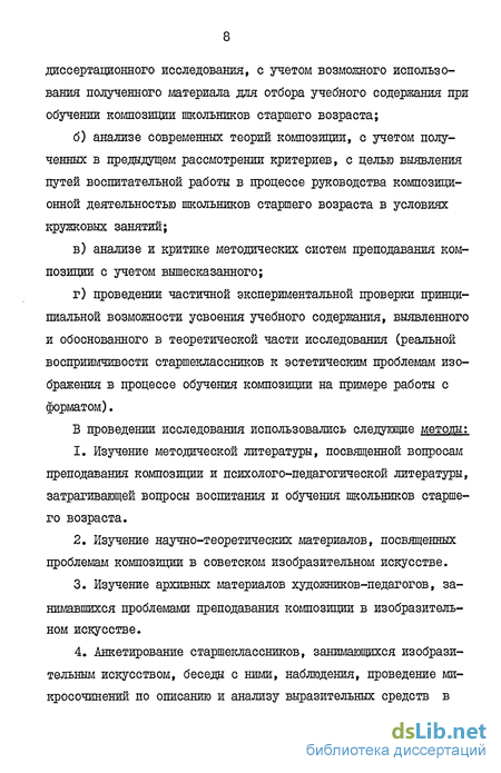 Методика исследования заключалась в: а) рассмотрении, опираясь на современное учение об эстетическом воспитании, ключевых понятий, вынесенных в заглавие диссертационного исследования, с учетом возможного использования полученного материала для отбора учебного содержания при обучении композиции школьников старшего возраста; б) анализе современных теорий композиции, с учетом полу ченных в предыдущем рассмотрении критериев, с целью выявления путей воспитательной работы в процессе руководства композици онной деятельностью школьников старшего возраста в условиях кружковых занятий; в) анализе и критике методических систем преподавания ком позиции с учетом вышесказанного; г) проведении частичной экспериментальной проверки принци пиальной возможности усвоения учебного содержания, выявленного и обоснованного в теоретической части исследования (реальной восприимчивости старшеклассников к эстетическим проблемам изо бражения в процессе обучения композиции на примере работы с форматом).