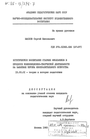 Предметом исследования являлось эстетическое развитие старшеклассников в процессе композиционной деятельности в условиях внеклассных и внешкольных занятий.