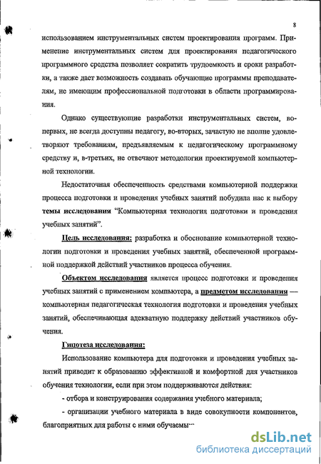 Объектом исследования является процесс подготовки и проведения учебных занятий с применением компьютера, а предметом исследования — компьютерная педагогическая технология подготовки и проведения учебных занятий, обеспечивающая адекватную поддержку действий участников обучения.