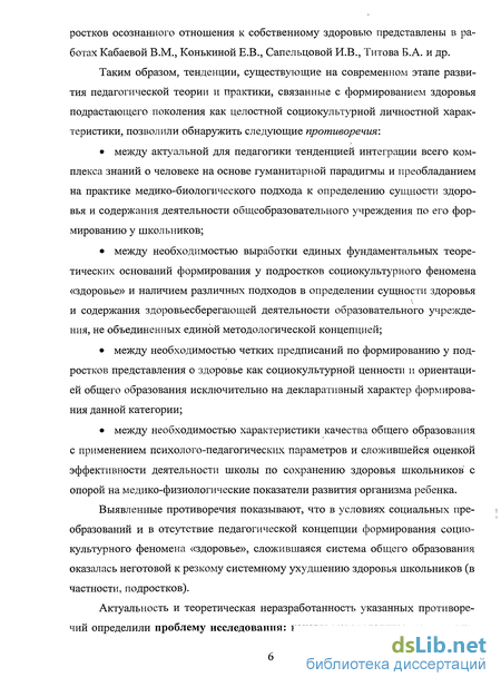 Анализ педагогической практики (Барканова СВ., Баль Л.В., Безруких М.М., Дубровинская Н.В., Смирнов Н.К., Фабер Д.А. и др.) показывает, что, несмотря на то, что задача укрепления и сохранения здоровья детей и подростков выделяется в качестве одной из ведущих в деятельности школы, в большинстве из них используются малодейственные формы по формированию здоровья как целостного социокультурного феномена. Чаще всего в общеобразовательных учреждениях акцент в сохранении и укреплении здоровья школьников переносится на медицинскую диагностику, оздоровительные, физиотерапевтические и другие лечебные мероприятия. Особенно это характерно для инновационных школ различного типа и вида, в которых медицинские мероприятия нередко используются как вариант снижения отрицательных влияний нетрадиционно организованного учебного процесса. Действующие программы работы школы по исследуемой проблеме с ярко выраженной информационно-профилактической направленностью так же являются малоэффективными при формировании у подростков здоровья как социокультурного феномена.