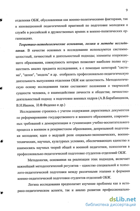 Исследование строилось с учетом содержания директивных документов по реформированию государственного и военного образования, современных требований к демократизации и гуманизации учебно-воспитательного процесса в военном и резервистском образовании, допризывной подготовки молодежи; идеи о ведущей роли социально-экономических, военно-технических, научных, культурных условиях, обеспечивающих единство и взаимосвязь научных теорий общей и военной педагогики, психологии в профессионально-педагогической подготовке студентов отделений ОБЖ.
