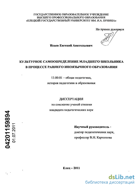 Предметом исследования является система формирования культурного самоопределения младшего школьника в процессе раннего иноязычного образования.