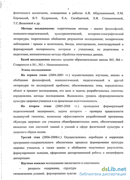 На; первом, этапе (2004-2005 гг.) осуществлялись изучение, анализ и обобщение философской, психологической, педагогической и другой литературы по исследуемой проблеме; обосновывалась, тема, определялись объект и'', предмет исследования,: его цель и задачи; разрабатывалась гипотеза; определялись методы: исследования. Выявлялись, уровень сформированности культуры здоровья учащихся и их физическая подготовленность.
