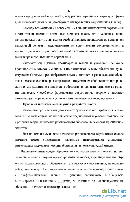 В связи с этим особую значимость приобретают исследования, посвященные вопросам становления и развития личностно-развивающего обучения в истории педагогики и современной дидактике. В отечественной педагогике эти вопросы рассматривались преимущественно на материале сначала советской школы, затем российской, т.е. школы с русским языком обучения. Опыт же личностно-развивающего образования в школах с родным или национально-русским двуязычием оставался практически не изученным.