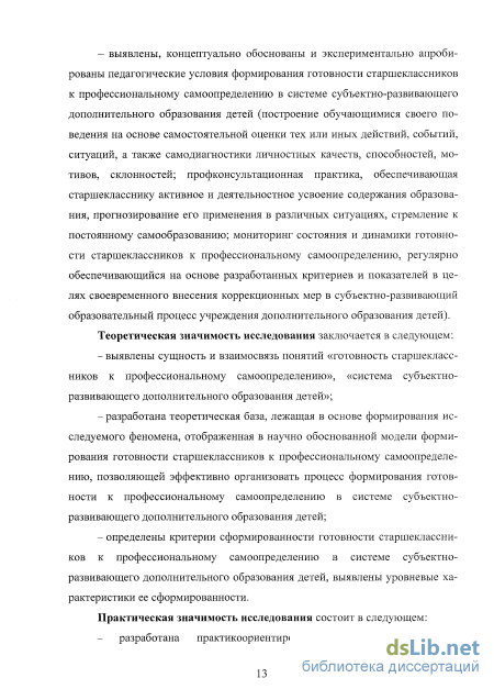 – выявлены, концептуально обоснованы и экспериментально апробированы педагогические условия формирования готовности старшеклассников к профессиональному самоопределению в системе субъектно-развивающего дополнительного образования детей (построение обучающимися своего поведения на основе самостоятельной оценки тех или иных действий, событий, ситуаций, а также самодиагностики личностных качеств, способностей, мотивов, склонностей; профконсультационная практика, обеспечивающая старшекласснику активное и деятельностное усвоение содержания образования, прогнозирование его применения в различных ситуациях, стремление к постоянному самообразованию; мониторинг состояния и динамики готовности старшеклассников к профессиональному самоопределению, регулярно обеспечивающийся на основе разработанных критериев и показателей в целях своевременного внесения коррекционных мер в субъектно-развивающий образовательный процесс учреждения дополнительного образования детей).