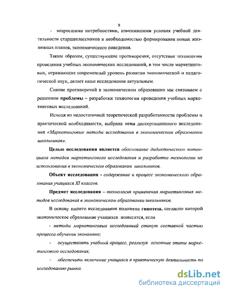 Исходя из недостаточной теоретической разработанности проблемы и практической необходимости, выбрана тема диссертационного исследования «Маркетинговые методы исследования в эконолшческом образовании школьников».