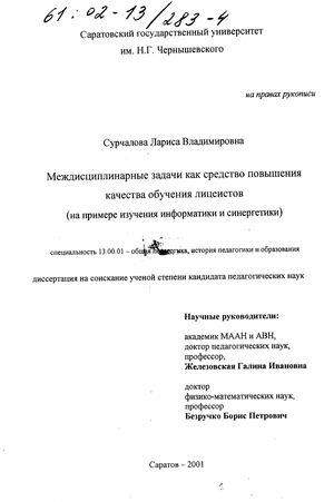 Предмет исследования - междисциплинарные задачи как средство повышения качества обучения лицеистов.