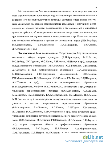 Методология исследования. Методологической основой исследования является идея антропоцентризма в философии образования. Исследование опирается также на системный и целостный подходы, позволяющие рассматривать образовательный процесс целостным объектом научного изучения, вскрывать взаимосвязи его компонентов. Методологическая база исследования основывается на ведущих положениях науки: системная организация окружающего мира; понимание человека в контексте его биосоциокультурной природы; здоровый образ жизни как сис тема управления здоровьем; взаимодействие смысловой и причинной детерминации активности человека; представление о деятельностнои и творческой сущности субъекта, об универсальном механизме его развития в диалоге культур; диалектика как научная теория и метод познания и др. Логика исследования потребовала обращения к трудам по методологии науки (И.В.Блауберг, В.И.Загвязинский, В.В.Краевский, Л.А.Микешина, В.С.Степин, Д.И.Фельдштейн и др.). Теоретическая база исследования. Теоретическую базу исследования составляют: общая теория культуры (А.И.Арнольдов, М.М.Бахтин, В.С.Библер, П.С.Гуревич, М.С.Каган, Л.Н.Коган, М.Шелер и др.), концепция фундаментального образования (М.Н.Берулава, Ю.В.Громыко, С.В.Кинелев, А.И.Субетто и др.), гуманитаризации образования (Ш.А.Амонашвили, М.В.Богуславский, Б.С.Гершунский, А.С.Запесоцкий, П.П.Козлова, Г.В.Мухаметзянова, Н.Д.Никандров, Ю.В.Сенько, Р.М.Рогова, В.Д.Шадриков, А.Н.Утехина и др.), личностно ориентированного образования (Е.В.Бондаревская, Э.Ф.Зеер, В.В.Сериков, И.С.Якиманская и др.), теория оптимизации образовательного процесса (Ю.К.Бабанский, А.А.Баранов, М.А.Данилов, В.В.Краевский, Ю.А.Конаржевский, Н.И.Леонов, И.Я.Лернер, М.Н.Скаткин и др.), закономерности профессионально-личностного развития учителя в системе непрерывного педагогического образования (Р.М.Асадуллин, В.А.Болотов, А.С.Гаязов, Л.И.Гурье, Л.М.Митина, В.Г.Рындак, В.А.Сластенин, В.И.Слободчиков и др.), идеи личностно ориен тированных технологий обучения в системе высшего педагогического образования (В.П.Беспалько, М.В.Кларин, Г.Ю.Ксензова, Д.Г.Левитес, В.Я.Ляудис и др.), теория содержания общего и профессионального образования (В.В.Краевский, В.С.Леднев, И.Я.Лернер, А.А.Мирошниченко, Л.М.Перминова, П.К.Петров, М.Н.Скаткин и др.), теория педагогического творчества (В.И.Загвязинский, З.И.Калмыкова, В.А.Кан-Калик, А.М.Матюшкин, Н.Д.Никандров, В.А.Сластенин, В.Шукшунов, Е.Л.Яковлева и др.), развивающего обучения (образования) (Ю.Л.Азаров, В.В.Давыдов, С.Ю.Темина, Н.Н.Тулькибаева, Д.Б.Эльконин и др.), поэтапного формирования умственной деятельности (П.Я.Гальперин, Н.Ф.Талызина и др.), мотивации, произвольной и непроизвольной регуляции поведения (Б.Г.Ананьев, Л.И.Божович, М.Р.Гинзбург, Г.Е.Залесский, В.А.Иванников, В.Я.Ляудис, А.Маслоу, Ю.М.Орлов, А.К.Осницкий, Г.Н.Сытин, Д.Н.Узнадзе и др.).