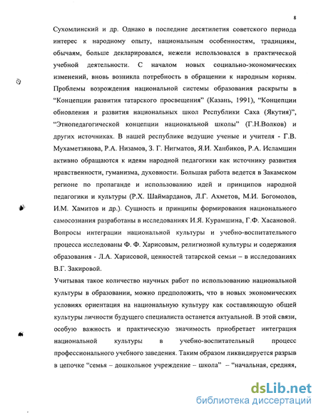 Сухомлинский и др. Однако в последние десятилетия советского периода интерес к народному опыту, национальным особенностям, традициям, обычаям, больше декларировался, нежели использовался в практической учебной деятельности. С началом новых социально-экономических изменений, вновь возникла потребность в обращении к народным корням. Проблемы возрождения национальной системы образования раскрыты в "Концепции развития татарского просвещения" (Казань, 1991), "Концепции обновления и развития национальных школ Республики Саха (Якутия)", "Этнопедагогической концепции национальной школы" (Г.Н.Волков) и других источниках. В нашей республике ведущие ученые и учителя - Г.В. Мухаметзянова, Р.А. Низамов, 3. Г. Нигматов, Я.И. Ханбиков, Р.А. Исламшин активно обращаются к идеям народной педагогики как источнику развития нравственности, гуманизма, духовности. Большая работа ведется в Закамском регионе по пропаганде и использованию идей и принципов народной педагогики и культуры (Р.Х. Шаймарданов, Л.Г. Ахметов, М.И. Богомолов, И.М. Хамитов и др.). Сущность и принципы формирования национального самосознания разработаны в исследованиях И.Я. Курамшина, Г.Ф. Хасановой. Вопросы интеграции национальной культуры и учебно-воспитательного процесса исследованы Ф. Ф. Харисовым, религиозной культуры и содержания образования - Л.А. Харисовой, ценностей татарской семьи — в исследованиях В.Г. Закировой.
