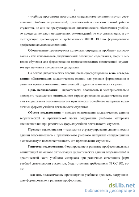 На основе дидактических теорий, была сформулирована тема исследования: «Оптимизация дидактических единиц как условие формирования и развития профессиональных компетенций студентов технических вузов».