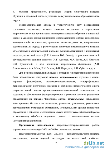 Методологическую основу и теоретическую базу исследования составляют положения, которые являются исходными в определении теоретических основ организации мониторинга качества обучения в начальной школе в условиях надмуниципального образовательного округа; философские категории свойства и качества; принципы гуманизма, развития, детерминизма; содержательный подход в рассмотрении психолого-педагогического явления, качественный и количественный подходы, феноменологический и сущностный подходы, целостный подход (Б. Г. Ананьев, Б. Ф. Ломов), теория деятельностной обусловленности развития личности (А. Г. Асмолов, М. Я. Басов, А. Н. Леонтьев, С. Л. Рубинштейн и др.), концепция непрерывного образования (А. П. Владиславлев, А. А. Мерк, Е. И. Огарев, Ф. И. Перегудов, А. И. Субетто и др.).