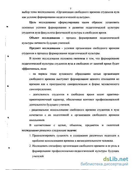 Предмет исследования - условия организации свободного времени студентов в процессе формирования педагогической культуры.