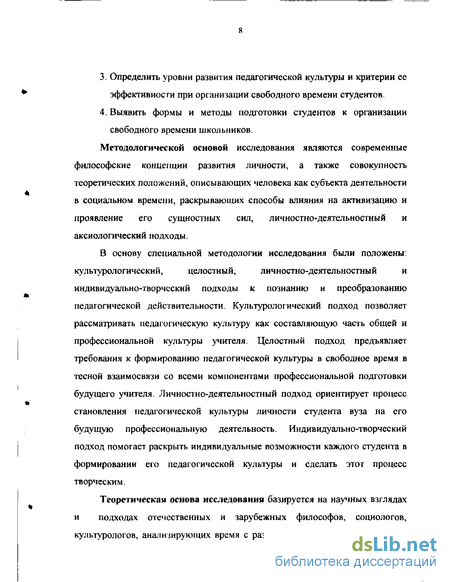 В основу специальной методологии исследования были положены: культурологический, целостный, личностно-деятельностный и индивидуально-творческий подходы к познанию и преобразованию педагогической действительности. Культурологический подход позволяет рассматривать педагогическую культуру как составляющую часть общей и профессиональной культуры учителя. Целостный подход предъявляет требования к формированию педагогической культуры в свободное время в тесной взаимосвязи со всеми компонентами профессиональной подготовки будущего учителя, Личностно-деятельностный подход ориентирует процесс становления педагогической культуры личности студента вуза на его будущую профессиональную деятельность. Индивидуально-творческий подход помогает раскрыть индивидуальные возможности каждого студента в формировании его педагогической кулыуры и сделать этот процесс творческим.