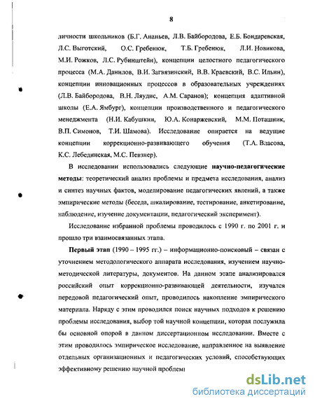 Первый этап (1990- 1995 гг.) - информационно-поисковый - связан с уточнением методологического аппарата исследования, изучением научно-методической литературы, документов. На данном этапе анализировался российский опыт коррекционно-развивающей деятельности, изучался передовой педагогический опыт, проводилось накопление эмпирического материала. Наряду с этим проводился поиск научных подходов к решению проблемы исследования, выбор той научной концепции, которая послужила бы основной опорой в данном диссертационном исследовании. Вместе с этим проводилось эмпирическое исследование, направленное на выявление отдельных организационных и педагогических условий, способствующих эффективному решению научной проблемы.