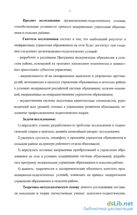 Предмет исследования: организационно-педагогические условия, способствующие успешности процесса модернизации управления образованием в сельских районах.