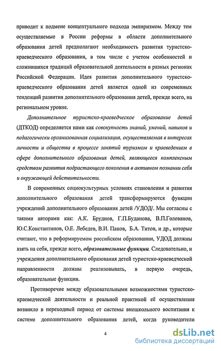 приводит к подмене концептуального подхода эмпиризмом. Между тем осуществляемые в России реформы в области дополнительного образования детей предполагают необходимость развития туристско-краеведческого образования, в том числе с учетом особенностей и сложившихся традиций образовательной деятельности в разных регионах Российской Федерации. Идея развития дополнительного туристско-краеведческого образования детей является одной из современных тенденций развития дополнительного образования детей, прежде всего, на региональном уровне.
