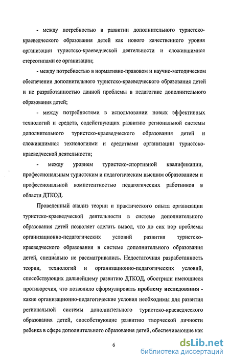 Проведенный анализ теории и практического опыта организации туристско-краеведческой деятельности в системе дополнительного образования детей позволяет сделать вывод, что до сих пор проблемы организационно-педагогических условий развития туристско-краеведческого образования в системе дополнительного образования детей, специально не рассматривались. Недостаточная разработанность теории, технологий и организационно-педагогических условий, способствующих дальнейшему развитию ДТКОД, обострили имеющиеся противоречия, что позволило сформулировать проблему исследования -какие организационно-педагогические условия необходимы для развития региональной системы дополнительного туристско-краеведческого образования детей, способствующие развитию творческой личности ребенка в сфере дополнительного образования детей, обеспечивающие как
