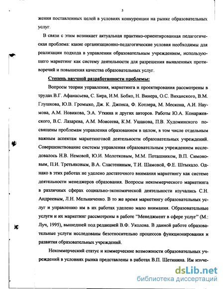 Вопросы теории управления, маркетинга и проектирования рассмотрены в трудах В.Г. Афанасьева, С. Бира, И.М. Бобко, Н. Винера, О.С. Виханского, В.М. Глушкова, Ю.В. Громыко, Дж. К. Джонса, Ф. Котлера, М. Мескона, А.И. Наумова, A.M. Новикова, Э.А. Уткина и других авторов. Работы Ю.А. Конаржев-ского, B.C. Лазарева, A.M. Моисеева, К.М. Ушакова, П.В. Худоминского посвящены проблемам управления образованием в целом, в том числе отдельным важным аспектам маркетинговой деятельности образовательных учреждений. Совершенствование системы управления образовательным учреждением исследовалось Н.В. Немовой, Ю.И. Молотковым, М.М. Поташником, В.П. Симоновым, П.И. Третьяковым, В.А. Сластениным, Т.И. Шамовой, Ф.Е. Штыкало. Однако в этих работах не уделено достаточного внимания маркетингу как системе деятельности менеджеров образования. Вопросы некоммерческого маркетинга в различных сферах социально-экономической деятельности изучались С.Н. Андреевым, Л.Н. Мельниченко. В то же время маркетингу образовательных услуг и управлению им в их работах уделено мало внимания. Образовательные услуги и их маркетинг рассмотрены в работе "Менеджмент в сфере услуг" (М.: Луч, 1995), вышедшей под редакцией В.Ф. Уколова. В данной работе образовательные услуги исследованы безотносительно процессов функционирования и развития образовательных учреждений.