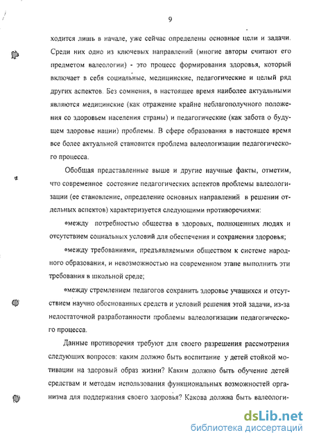 Обобщая представленные выше и другие научные факты, отметим, что современное состояние педагогических аспектов проблемы валеологизации (ее становление, определение основных направлений в решении отдельных аспектов) характеризуется следующими противоречиями: между потребностью общества в здоровых, полноценных людях и отсутствием социальных условий для обеспечения и сохранения здоровья; между требованиями, предъявляемыми обществом к системе народного образования, и невозможностью на современном этапе выполнить эти требования в школьной среде; между стремлением педагогов сохранить здоровье учащихся и отсутствием научно обоснованных средств и условий решения этой задачи, из-за недостаточной разработанности проблемы валеологизации педагогического процесса.