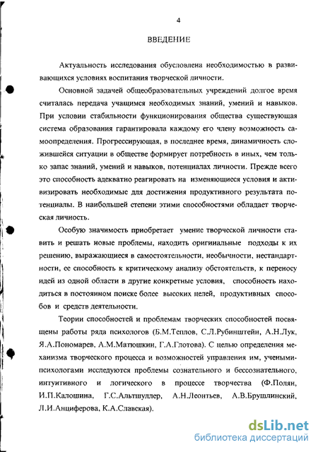 Теории способностей и проблемам творческих способностей посвящены работы ряда психологов (Б.М.Теплов, С.Л.Рубинштейн, А.НЛук, Я.А.Пономарев, А.М.Матюшкин, Г.А.Глотова). С целью определения механизма творческого процесса и возможностей управления им, учеными-психологами исследуются проблемы сознательного и бессознательного, интуитивного и логического в процессе творчества (Ф-Полян, И.П.Калошина, Г.С.Альтшуллер, А.Н.Леонтьев, А.В.Брушлинский, Л.И.Анциферова, К.А.Славская).