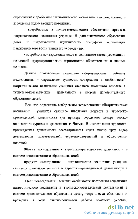 Данные противоречия позволили сформулировать проблему исследования - определение сущности, содержания и особенностей патриотического воспитания учащихся старшего школьного возраста в туристско-краеведческои деятельности в системе дополнительного образования детей.