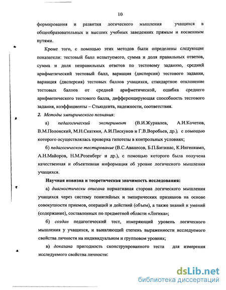 подбора и применения такого комплекса математико-статистических методов, которые позволяют: проверить качество теста по критериям валидности и надежности, обработать первичные данные и получить объективную информацию о результатах развития и формирования исследуемого свойства личности косвенным (изучение общеобразовательных предметов) и прямым (изучение дисциплины «Логика») путями в общеобразовательных (старшие классы) и высших (первые курсы) учебных заведениях.