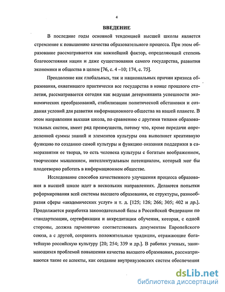 Исследование способов качественного улучшения процесса образования в высшей школе идет в нескольких направлениях. Делаются попытки реформирования всей системы высшего образования, ее структуры, разнообразия сферы «академических услуг» и т. д. [125; 126; 266; 305; 402 и др.]. Продолжается разработка законодательной базы в Российской Федерации по стандартизации, сертификации и аккредитации обучения, которая, с одной стороны, должна гармонично соответствовать документам Европейского союза, а с другой, сохранить положительные традиции, отражающие богатейшую российскую культуру [20; 254; 339 и др.]. В работах ученых, занимающихся проблемой повышения качества высшего образования, рассматриваются такие ее аспекты, как создание внутривузовских систем обеспечения