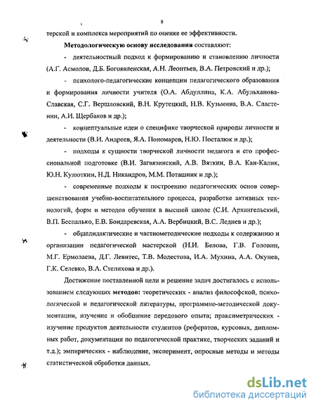 Достижение поставленной цели и решение задач достигалось с использованием следующих методов: теоретических - анализ философской, психологической и педагогической литературы, программно-методической документации, изучение и обобщение передового опыта; праксиметрических -изучение продуктов деятельности студентов (рефератов, курсовых, дипломных работ, документации по педагогической практике, творческих заданий и т.д.); эмпирических - наблюдение, эксперимент, опросные методы и методы статистической обработки данных.