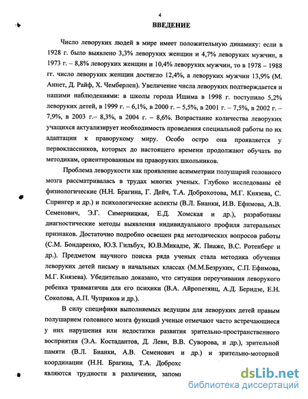 Проблема леворукости как проявление асимметрии полушарий головного мозга рассматривалась в трудах многих ученых. Глубоко исследованы её физиологические (Н.Н. Брагина, Г. Дейч, Т.А. Доброхотова, М.Г. Князева, С. Спрингер и др.) и психологические аспекты (В.Л. Бианки, И.В. Ефимова, А.В. Семенович, Э.Г. Симерницкая, Е.Д. Хомская и др.), разработаны диагностические методы выявления индивидуального профиля латеральных признаков. Достаточно подробно освещен ряд методических вопросов работы (СМ. Бондаренко, Ю.З. Гильбух, Ю.В.Микадзе, Ж. Пиаже, B.C. Ротенберг и др.). Предметом научного поиска ряда ученых стала методика обучения леворуких детей письму в начальных классах (М.М.Безруких, СП. Ефимова, М.Г. Князева). Убедительно доказано, что ситуация переучивания леворукого ребенка травматична для его психики (В.А. Айропетянц, А.Д. Беридзе, Е.Н. Соколова, А.П. Чуприков и др.).