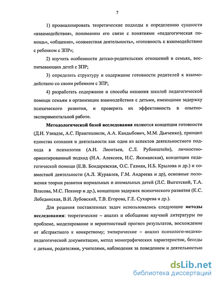 Предмет исследования: содержание, способы, формы и условия оказания школой педагогической помощи семьям, воспитывающим детей с задержкой психического развития.