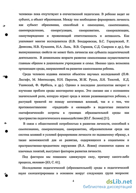 Большинство диссертационных исследований посвящено изучению педагогической среды в школьных (Н.О. Гафурова (1996), И.В. Крупина (2001), Л.А. Боденко (1999) и др.) и высших (Н.А. Сизинцева (1999), А.А. Новикова (1999)) учебных заведениях. Диссертационные исследования среды в дошкольных учреждениях практически отсутствуют.