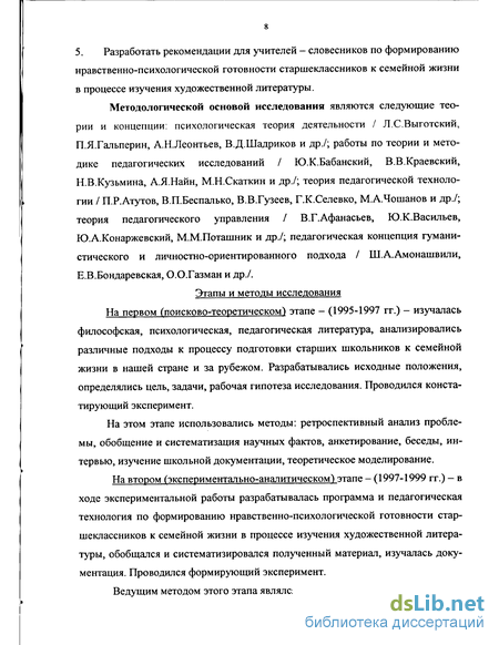 Этапы и методы исследования На первом (поисково-теоретическом) этапе - (1995-1997 гг.) - изучалась философская, психологическая, педагогическая литература, анализировались различные подходы к процессу подготовки старших школьников к семейной жизни в нашей стране и за рубежом. Разрабатывались исходные положения, определялись цель, задачи, рабочая гипотеза исследования. Проводился констатирующий эксперимент.