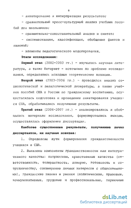 Второй этап (2003-2006 гг.) - проводился анализ социологической и педагогической литературы, а также учебных пособий США и России по гражданскому воспитанию, осуществлялась подготовка и проведение анкетирования учащихся США, обрабатывались полученные результаты.