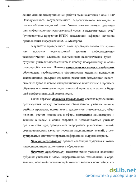 Результаты проведенного нами предварительного тестирования показали недостаточный уровень информационно-технологической адаптации выпускников педагогических вузов -будущих учителей-предметников к новому программному и аппаратному обеспечению. Поэтому актуальность темы исследования обусловлена необходимостью сформировать механизм повышения адаптационных ресурсов студентов различных факультетов педагогических вузов к новым информационным технологиям в процессе обучения и прохождения педагогической практики, а также в будущей профессиональной деятельности.