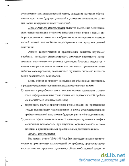 Целью данного исследования является выявление педагогических основ адаптации студентов педагогических вузов к новым информационным технологиям в образовании и исследование возможностей метода понятийного моделирования как средства данной адаптации.
