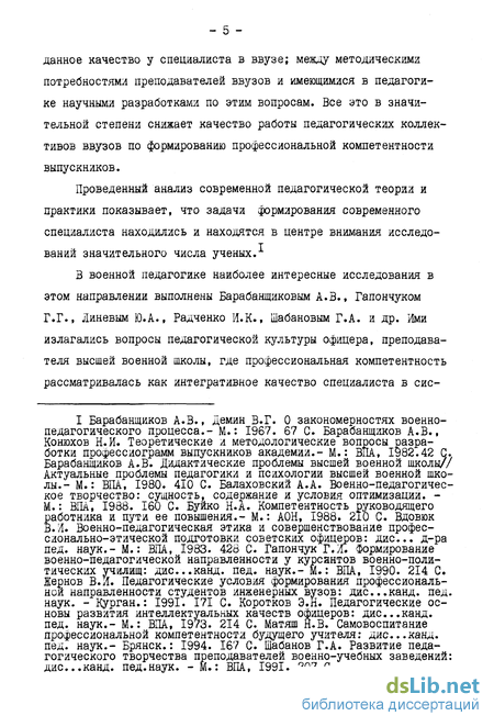 В военной педагогике наиболее интересные исследования в этом направлении выполнены Барабанщиковым А.В., Гапончуком Г.Г., Линевым Ю.А., Радченко И.К., Шабановым Г.А. и др. Ими излагались вопросы педагогической культуры офицера, преподавателя высшей военной школы, где профессиональная компетентность рассматривалась как интегративное качество специалиста в сис-